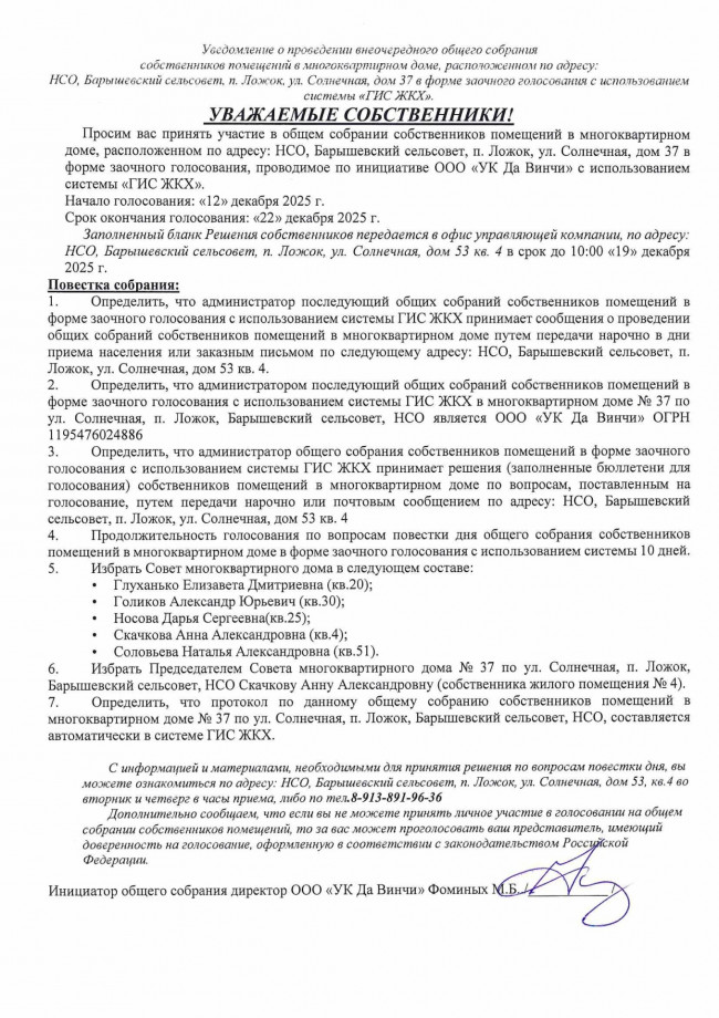 Сообщение об общем собрании собственников МКД № 37 по ул. Солнечной